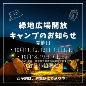 10月の緑地広場開放キャンプの日程をお知らせいたします。